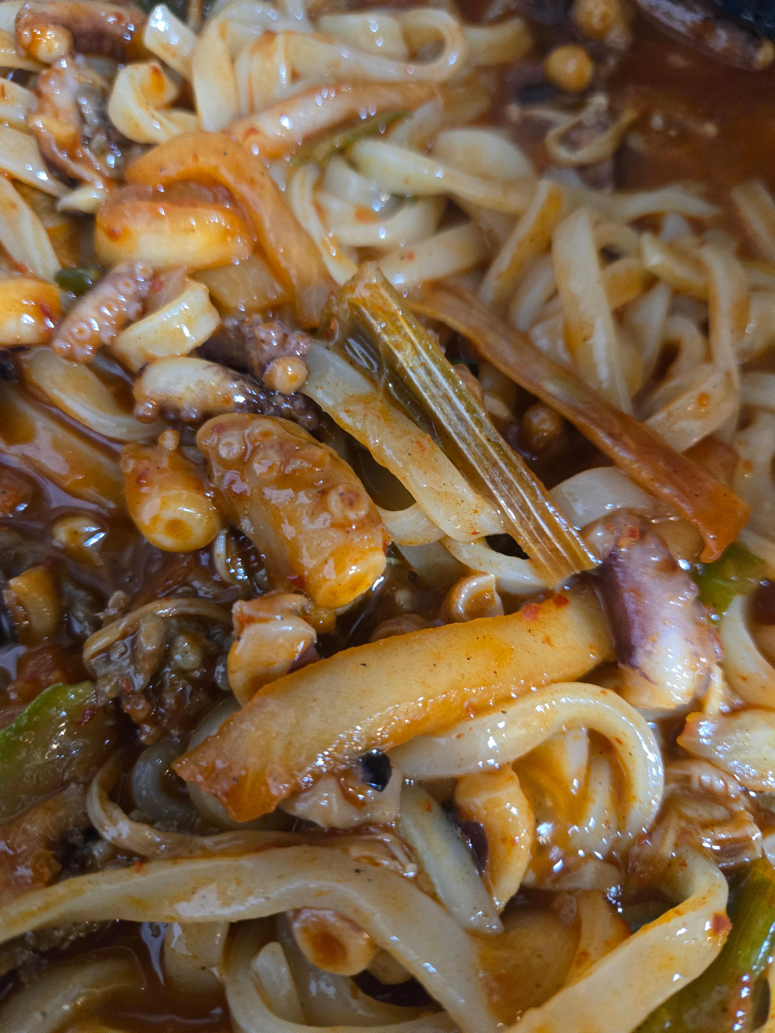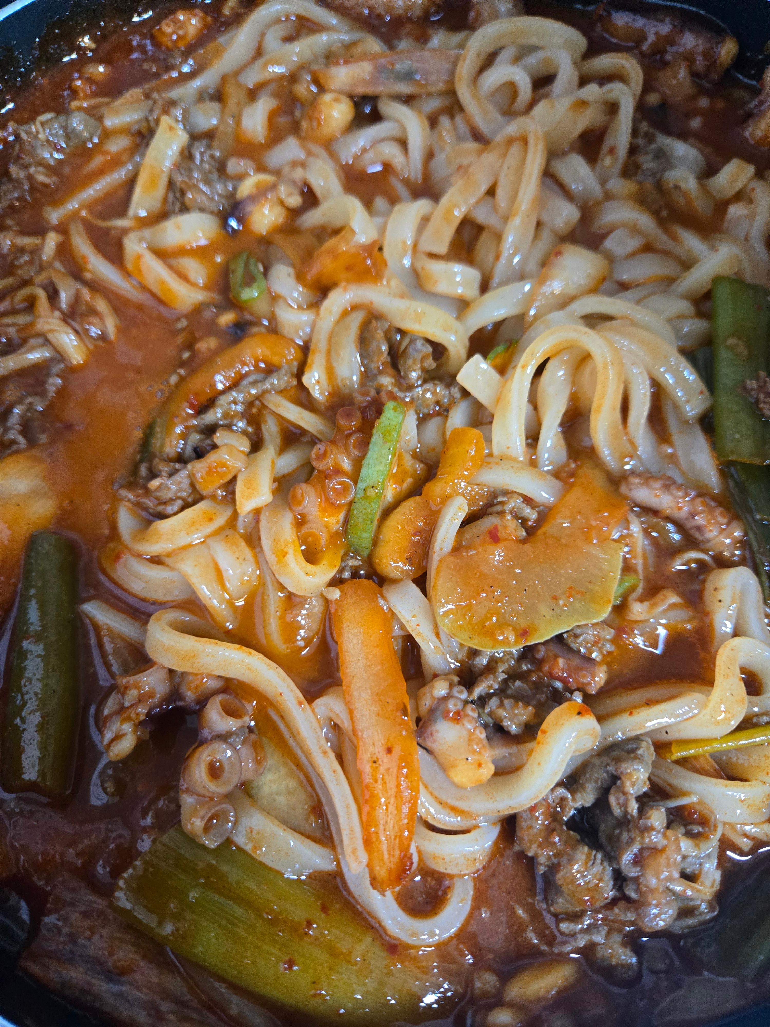 제품 포장에는 물을 넣고 끓이라고 안내되어 있는데, 저희는 칼칼한 맛을 좋아하는 편이라 권장량보다 물을 조금 적게 넣어 조리했습니다. 그랬더니 국물보다는 양념이 진하게 배어 있는 낙지볶음에 면을 곁들인 듯한 느낌으로 완성되더라구요.